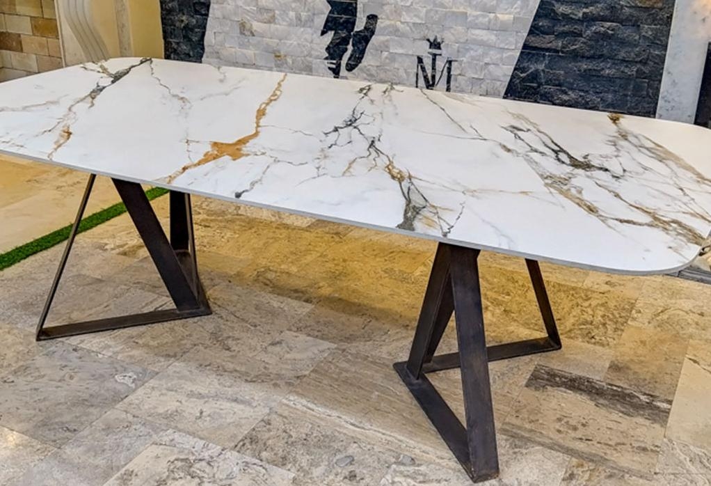 Designed Six Seater Dining Table with a mild metal frame and a sintered stone top can result in a modern and sophisticated piece of furniture.???????