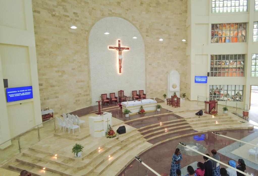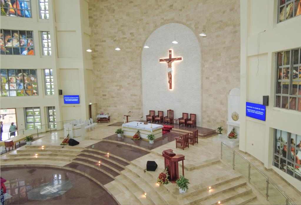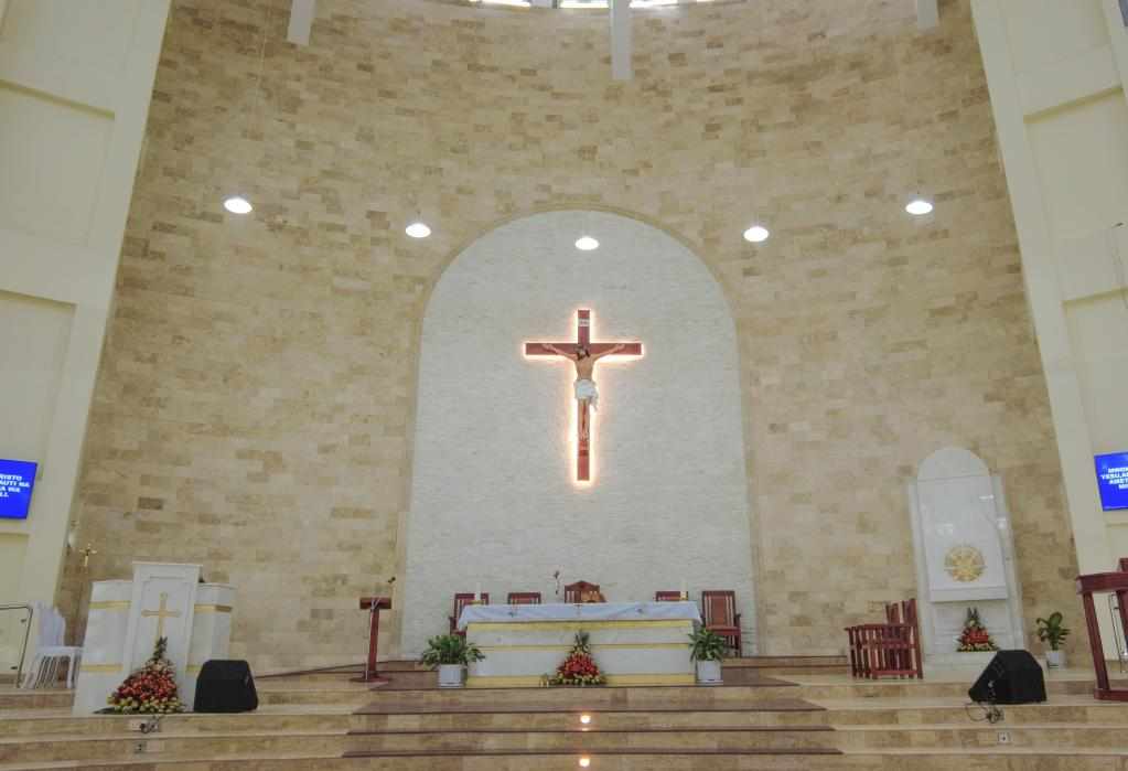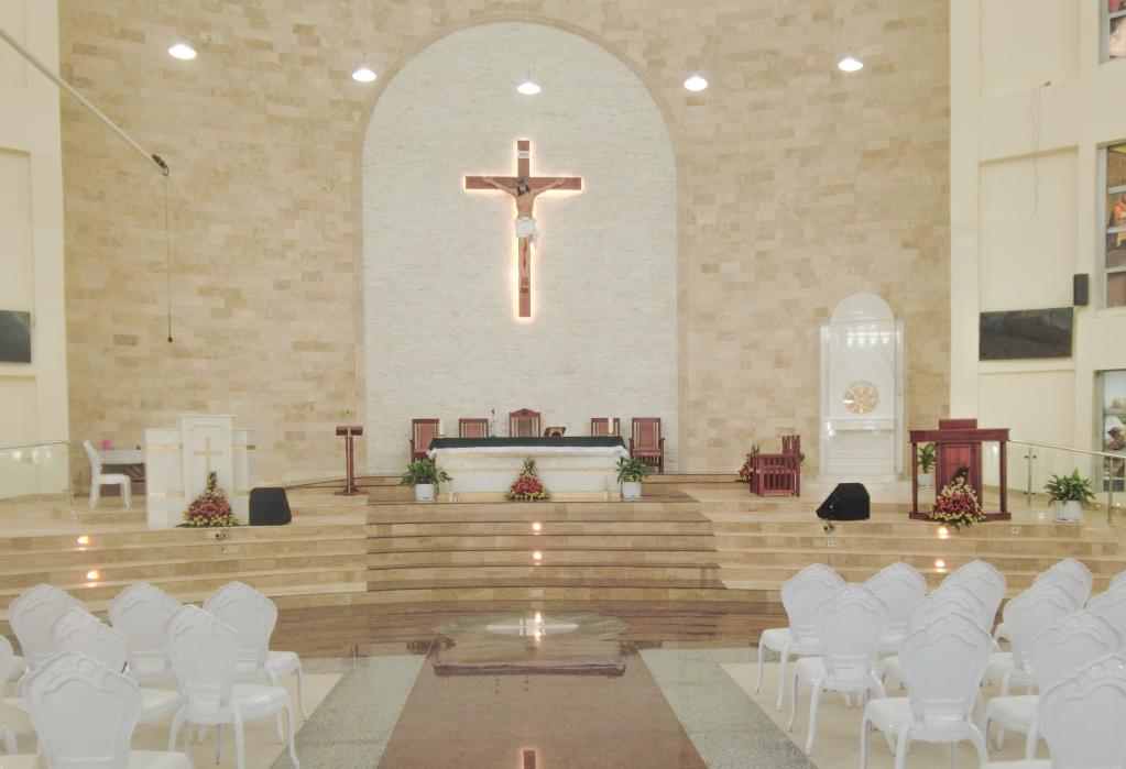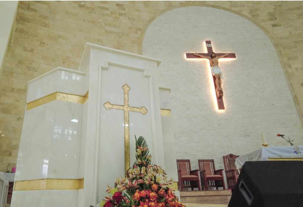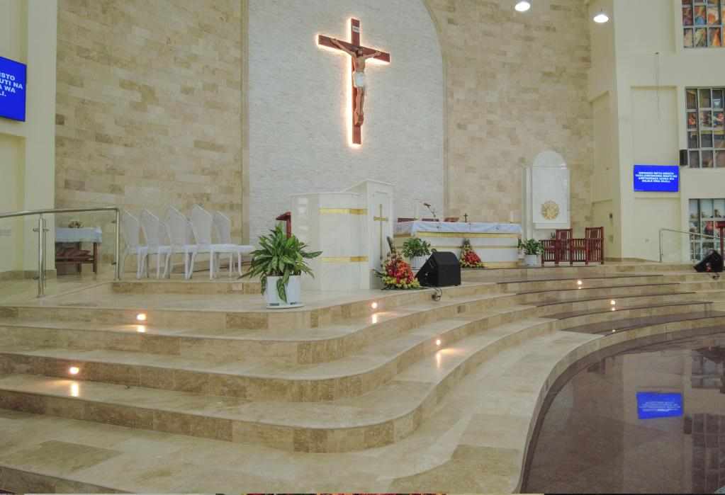 Alter section wall cladding using Classic Travertine and White stacking stone. Staircase flooring featuring Classic Travertine. Royal Red Granite flooring section adorned with a medallion.